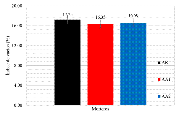 | Figura 10. Resultados de los ensayos de índice de vacíos (%) obtenidos com probetas de mortero sumergidas en agua a los 28 días. | ||||