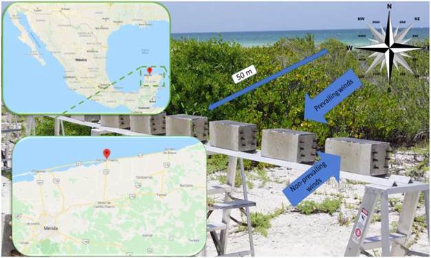 Specimens were exposed in a marine tropical environment on the north coast of the Yucatan Peninsula, Mexico. They were placed on the beach 50 m from the seashore and 0.95 m above the soil surface, positioning the area with most covering on the underside of the specimen Their orientation was such that they were exposed to different regional climate conditions: prevailing winds out of the northeast (PW) and non-prevailing winds out of the southwest (NPW) (Figure 3). The first set of specimens (2007) was exposed 261 days after cast and the second set (2017) 34 days after cast.