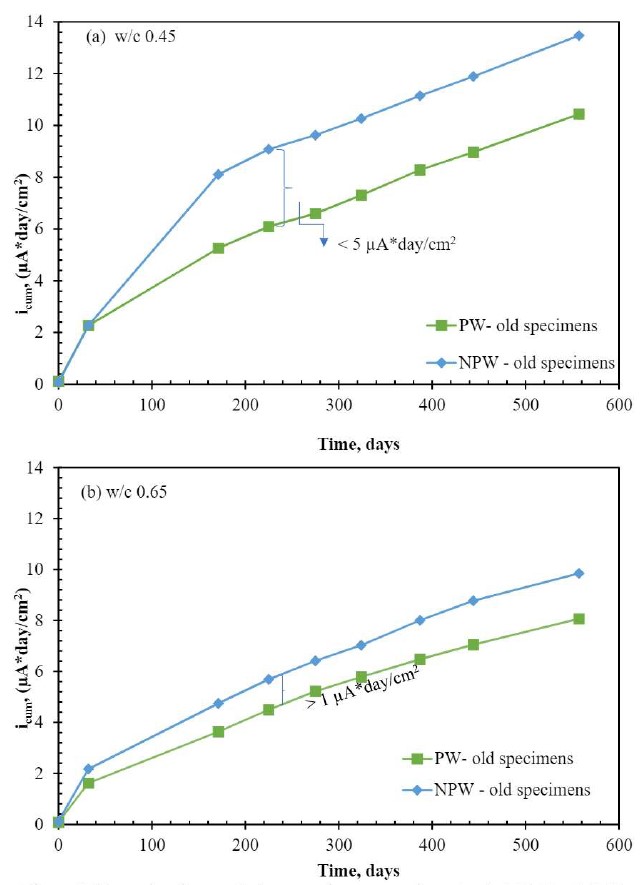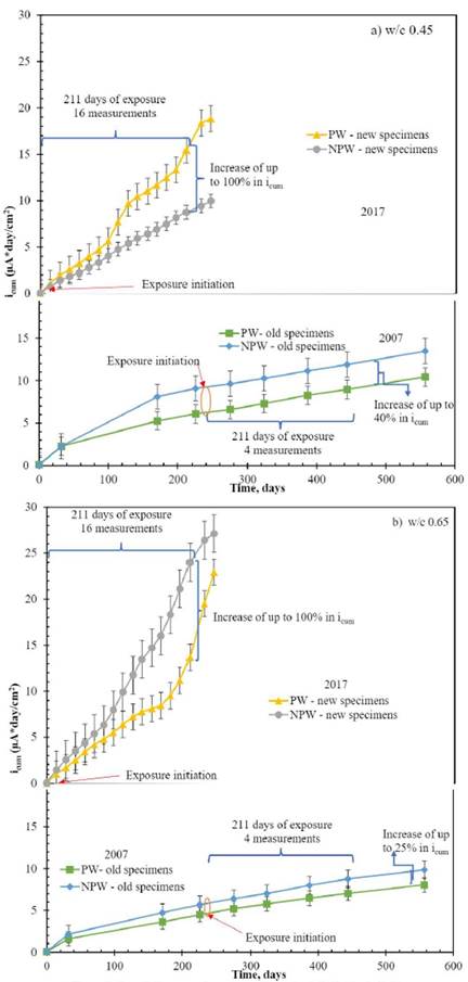 In Figure 6, the icum of the specimens made in 2007 corresponds to the moment just before exposure to the tropical marine environment. These specimens were under semi-controlled conditions (storage in a laboratory, sheltered from the rain and the sun and without control of relative humidity and temperature) for the entire period. No significant variations were noted at a measurement periodicity of approximately three months (Figure 4). Considering that they were electrochemically stable in the passivation zone, cumulative corrosion immediately before exposure to the natural environment differed between surfaces (PW and NPW), from 1 µA*day/cm2 for w/c 0.65 to 5 µA*day/cm2 for w/c 0.45. Ahmad (2003) mentions that the lower the cement content, the lower the plastic consistency in the mix, which causes that the passivation of the steel does not occur uniformly, resulting in the depassivation; therefore, the results found could represent the margin of uncertainty when interpreting icum at initial ages (passivation zone) and these differences (1 µA*day/cm2 for w/c 0.65 to 5 µA*day/cm2 for w/c 0.45) can be deemed as characteristics of the materials used.