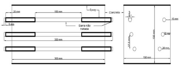 Utilizando o método de projeto do ACI (ACI 211-91, 2002), doze amostras prismáticas (150x150x300 mm) foram confeccionadas usando cimento Portland composto (CPC30R) padronizado pela norma mexicana (NMX-C-414-ONNCCE, 2014) e agregado de rochas calcárias típico do sudeste do México. A Tabela 1 mostra as características básicas do concreto: cura, condição de armazenamento, tipo de cimento e a relação água/cimento, e a Tabela 2, a dosagem do concreto. Cada amostra foi armada com seis barras de aço carbono classe 42 e 3/8” de diâmetro (350 mm de comprimento), colocadas em profundidades de 15, 20 e 30 mm. Antes da colocação nas amostras, a área de estudo era marcada em cada barra, deixando uma área livre de 150 mm de comprimento no centro. A barra restante foi pintada com tinta epóxi e sua extremidade coberta com fita isolante (Figura 1).