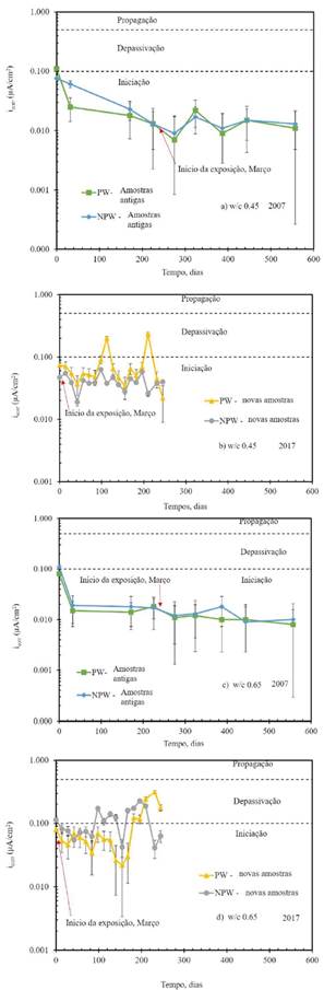 Por outro lado, os dados para a exposição 2017 (Figura 4.b), correspondentes a 27 dias em condições de laboratório e 211 dias de exposição natural, começaram a mostrar diferenças entre PW e NPW. Esses números confirmam uma diferença entre as duas qualidades de passivação, devido principalmente ao processo adequado de cura e armazenamento de amostras por 233 dias no ambiente não agressivo, sem agentes agressivos, para amostras de 2007. Portanto, a qualidade da passivação nas idades iniciais, permitiu um melhor comportamento eletroquímico instantâneo subsequente para 2007 (Figura 4.a) do que para as amostras de 2017 (Figura 4.b). A resposta do concreto de baixa qualidade (w/c 0,65) foi semelhante à do concreto de alta qualidade (w/c 0,45) para 2007 (Figura 4.c) e 2017 (Figura 4.d). No entanto, os dados instantâneos para ambas as proporções w/c parecem ser um pouco diferentes em 2017.