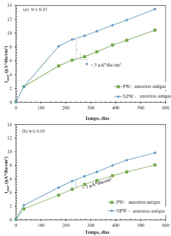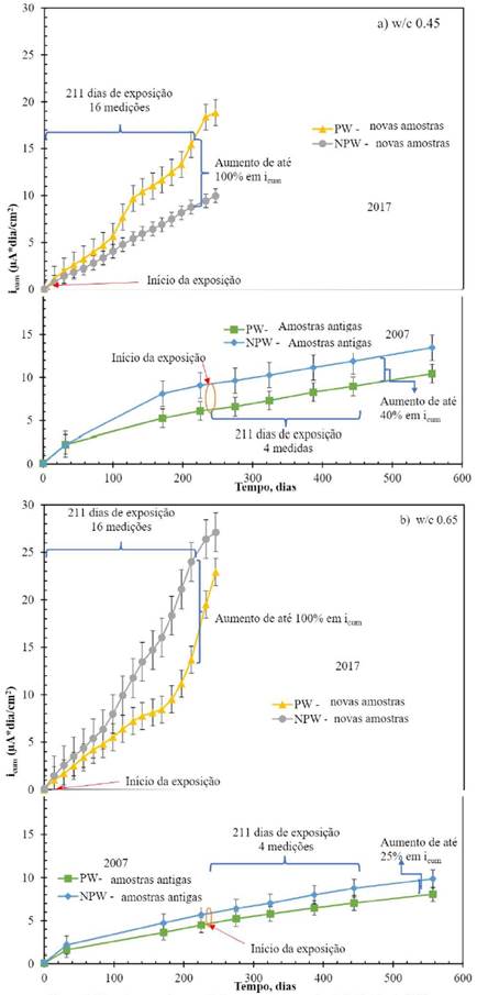 Na Figura 6, o icum das amostras moldadas em 2007 corresponde ao momento imediatamente anterior à exposição ao ambiente marinho tropical. Essas amostras ficaram em condições semi-controladas (armazenamento em laboratório, protegidas da chuva e do sol e sem controle da umidade e temperatura relativa) durante todo o período. Não foram observadas variações significativas em uma periodicidade de medição de aproximadamente três meses (Figura 4). Considerando que eram eletroquimicamente estáveis na zona de passivação, a corrosão cumulativa imediatamente antes da exposição ao ambiente natural diferia entre as superfícies (PW e NPW), de 1 µA*dia/cm2 para w/c = 0,65 a 5 µA*dia/cm2 para w/c = 0,45. Ahmad (2003) menciona que quanto menor o teor de cimento, menor a consistência plástica na mistura, o que faz com que a passivação do aço não ocorra uniformemente, resultando na despassivação; portanto, os resultados encontrados podem representar a margem de incerteza na interpretação do icum nas idades iniciais (zona de passivação) e essas diferenças (1 µA*dia/cm2 para w/c = 0,65 a 5 µA*dia/cm2 para w/c= 0,45) podem consideradas características dos materiais utilizados.
