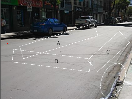 Figure 2 shows transversal (B) and longitudinal (A) cracking, crocodile leather texture (C), and aggregate detachment (D) among other defect appearances. Figure 3 shows the thermographic image of previously mentioned area, where varied colorimetry can be seen. This evidences a previous relation to damages observed in Figure 2.
