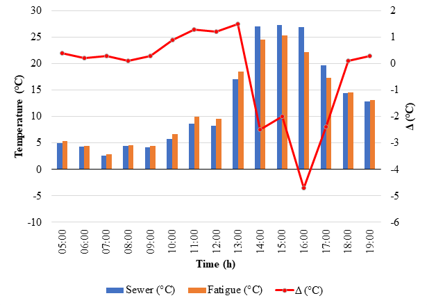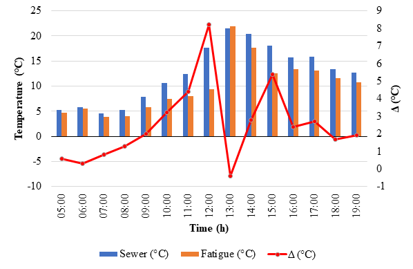 Regarding thermal gradient behavior with ambient temperature and relative humidity, it can be observed that maximum gradients occur when ambient temperature is high and relative humidity is low. Otherwise, when ambient temperature is low relative humidity is high, lower thermal gradients are present, 5:00 a.m. to 8:00 a.m., which confirm this technique is sensitive to environmental conditions (Rocha & Póvoas, 2017).