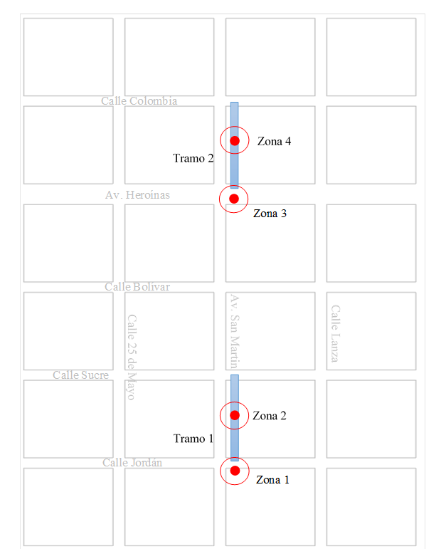 Foram selecionadas duas seções de estudo: a primeira localizada na avenida San Martin, entre as ruas Jordán e Sucre, na qual se defronta o Palácio da Justiça e o mercado 25 de Mayo; e a segunda na Avenida San Martin entre a Avenida Heroinas e a Rua Colômbia, em cuja linha reta existem centros comerciais e óticas.