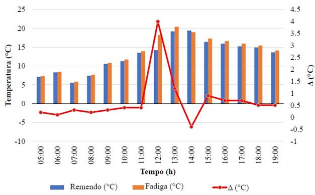 Para determinar a faixa horária ótima para obtenção das imagens termográficas, foi utilizada a diferença de temperatura de dois setores com características diferentes, a fim de obter um diferencial que pode ser avaliado por meio de um gráfico.