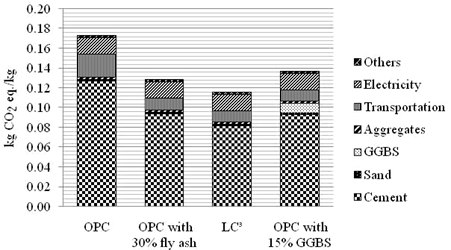 Partial substitution of OPC with SCMs can lead to significant reduction in the CO2 emissions associated with the production of cement; and hence, the production of concrete. In order to quantify the positive aspects related to the carbon footprint and environmental impact of concretes with blended binders, extensive investigations have been undertaken at IIT Madras using life cycle assessment (LCA) performed with data from various cement plants in India (Gettu et al., 2016, 2018, 2019). Figure 15 shows the CO2 emissions obtained for one of the case studies considering M50 concretes. These values are in the ranges reported in the literature; e.g., Flower and Sanjayan (2007) gave values of about 0.13 kg/kg for OPC concrete, and the embodied carbon values given by Hammond and Jones (2008) yield CO2 emissions of 0.13-0.16 kg/kg. More importantly, the plots indicate that in concretes with only OPC, more than 75% of the CO2 emissions are associated with the cement, while the majority of the remaining 25% of the CO2 emissions is associated with the transportation and electricity. This is also in agreement with the observations of Flower and Sanjayan (2007) and Marceau et al. (2007). Upon replacement of OPC with SCMs or blended binders, significant reduction in emissions is observed. It is seen that the use of fly ash and GGBS decreases the CO2 emissions by about 26% and 21% - similar to ranges reported by Flower and Sanjayan (2007). The LC3 concretes are very promising in terms of CO2 emissions, with a 30-35% reduction compared to OPC concretes with similar compressive strengths. In general, the use of locally available SCMs at higher dosages leads to significant reduction in the carbon footprint of concrete industry.