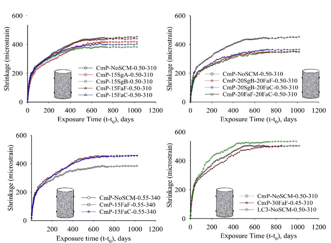 Ongoing tests at IIT Madras on the shrinkage of concretes with blended binders indicate that the incorporation of SCMs does not alter the drying shrinkage strain evolution significantly (see 4-year data in Figure 5). It can be concluded that replacement of OPC by ≤ 30% of slag and fly ash, at the same w/b, will not change the ultimate strains due to drying shrinkage. This is of considerable relevance to design practices because most shrinkage models do not directly give provisions for the estimating shrinkage in concretes with SCMs. The findings also indicate that the shrinkage models calibrated for OPC concretes (i.e., without SCMs) can be used for concretes with SCMs, with some recalibration, if needed