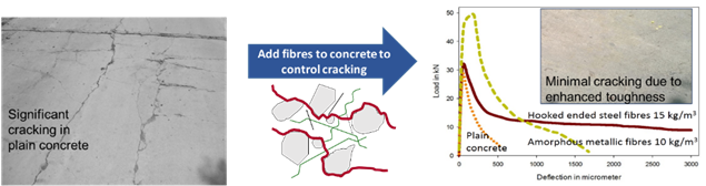 Concrete pavements are being used more extensively in many parts of the world, and this type of application is promising for the use of high volumes of fly ash in concrete. However, there could be problems (see Figure 6) of significant cracking due to the shrinkage and fatigue loading. Such problems cannot be resolved by just increasing the compressive strength of concrete and require targeted enhancement of the toughness, which is the key influencing parameter in providing adequate crack resistance. The incorporation of (steel, polymer, amorphous metal and glass) fibres for improving the toughness has been studied extensively at IIT Madras (see the image on the right in Figure 6), leading to guidelines for testing and design (Nayar and Gettu, 2015, 2018, 2020). Further work has also shown that steel fibres can dramatically prevent crack propagation in cracked concrete under a range of loading conditions (Jose et al., 2018; Stephen and Gettu, 2019a, 2019b).