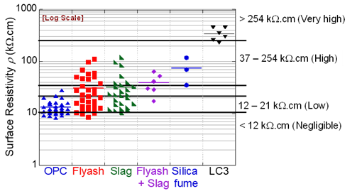 Wenner 4-probe surface resistivity of concretes with various SCMs