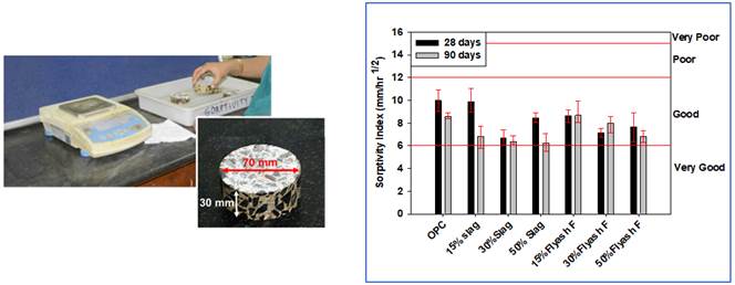 Due to the refined pore structure, concretes with SCMs also exhibit lower permeability (Dhanya and Santhanam, 2017). The charge passed in the rapid chloride penetration test is a good indicator of the permeability of concrete; Figure 9 indicates the significant resistance to charge transfer, especially when the replacement levels of slag and Class F fly ash are more than 30%. On the other hand, the performance of calcareous (Class C) fly ash is rated less than that of Class F fly ash and slag. Note that at 15% replacement level, both slag and Class C fly ash exhibit similar performance. Figure 10 shows data from water sorptivity tests, indicating that SCM based concretes show only marginally lower sorptivity than OPC concretes. The literature does not also provide any consensus on the water sorptivity and chloride penetration of concretes with SCMs. The authors believe that with appropriate mix-design, placement and curing practices, the positive aspects of SCMs can be exploited to enhance the durability of reinforced concrete systems.