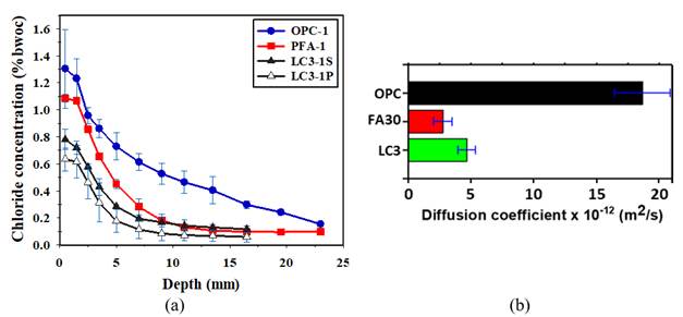 Many reports suggest that the resistance of concretes against chloride ingress can be greatly enhanced by using SCMs. The refined pore structure and enhanced chloride binding capacity are the major reasons for this. Figure 11a shows chloride profiles (ASTM C1556 tests) of concretes moist cured for 1 year; the curves for FA30 and LC3 systems exhibit steeper slopes than that for the OPC system - indicating lower chloride diffusion coefficients and better chloride binding capacity, which can be attributed to higher concentration of reactive alumina in the SCMs. Also, fly ash and LC3 systems exhibit about 75% in the chloride diffusion coefficients (see Figure 11b), with the LC3 systems possessing better chloride binding capability than those with fly ash. Pillai et al. (2018), and Dhandapani and Santhanam (2020) showed that the SCM type greatly influences the ageing factor or decay constant for the chloride diffusion coefficient. The appropriate choice of ageing factor is important to obtain more realistic service life estimates. See Table 2 for the recommended ranges of ageing factors for various binder systems; to be conservative, one may choose a lower value in the range given. For example, for systems with OPC, Class F fly ash, Class C fly ash, slag and LC3, it is recommended to use ageing factors of 0.1, 0.6, 0.4, 0.4 and 0.4, respectively, for the initial estimation of service life. The service life estimates can be refined by collecting field samples to obtain chloride profiles, and then determining the chloride diffusion coefficients and ageing factors at later ages.