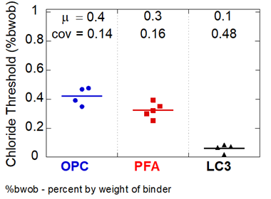 Service life can be defined primarily as the time taken to initiate corrosion (say, the corrosion free service life) for assessing the influence of SCMs, though it has been shown that fly ash can be beneficial in the propagation phase even in cracked concretes (Sangoju et al., 2011, 2015). For obtaining such service life estimates, in addition to the chloride diffusion coefficient and its decay constant, quantitative estimates of chloride threshold are essential. The test procedures adopting teelell corrosion measurements do not adequately detect the corrosion initiation in highly resistive concrete systems (such as those with LC3 and with SCMs and low w/b ratios). In such systems, corrosion initiates with macrocells or microcells forming on the same steel rebar, which is not detected in typical teelell test methods like ASTM G109 (Rengaraju et al., 2018). Also, linear polarization resistance techniques have limitations in detecting corrosion in highly resistive concrete systems (Rengaraju et al., 2019). Hence, an accelerated chloride threshold test method (hr-ACT test method) was developed to accommodate chloride threshold tests in highly resistive (hr) concrete systems (Pillai et al. 2018, Rengaraju, 2019). This test uses a lollipop-type steel-mortar specimen, the linear polarization resistance and/or the electrochemical impedance spectroscopy technique, and a statistical procedure to detect corrosion initiation. Consequently, probabilistic estimates of chloride threshold of various steel-cementitious systems could be developed (see Table 3). As seen in Table 3 and in Figure 12, there is a noticeable reduction in the chloride threshold from OPC to fly ash (i.e., PFA) to LC3 systems (from about 0.4 to 0.1 % by weight of binder), which can be attributed to the lower pH in the PFA and LC3 systems.