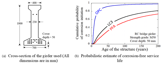 Nevertheless, one should note that achieving long service life is a consequence of the synergistic effect of many parameters (primarily the chloride diffusion coefficient, ageing factor and chloride threshold). In order to demonstrate the potential to enhance the service life of reinforcement concrete structures under chloride exposure through the incorporation of blended binders, a bridge girder (see Figure 13a) having a cover depth (d) of 50 mm, and exposed to a surface chloride concentration of 0.8% by weight of binder, is considered. The cumulative probabilities of corrosion initiation were obtained using the solution of Fick’s 2nd Law of Diffusion, in a MATLAB® programme SL-Chlor, considering d, D cl and Cl th as random variables (Pillai et al. 2018; Rengaraju, 2019). Figure 13a shows that SCM based systems can generally yield much longer service lives than the OPC systems.