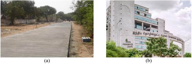 Pavimento de FRC no campus do IIT Madras e (b) o prédio da SCC no IIT Madras Research.