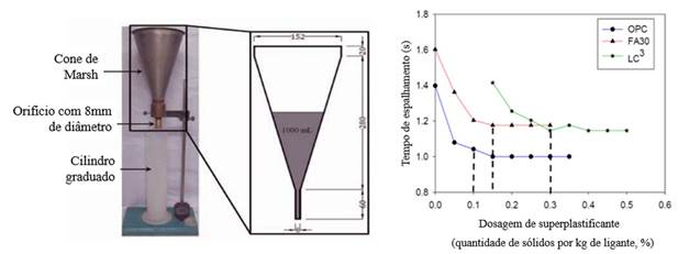 A presença de SCMs pode aumentar a demanda de superplastificante para alcançar o espalhamento ou trabalhabilidade exigidos. Eles também poderiam afetar a evolução das várias características reológicas em função do tempo. Consequentemente, as respostas de espalhamento do sistema de aglutinante misturado difeririam significativamente de um sistema de cimento Portland comum (OPC) com a mesma proporção de aglutinante e água (w/b), dependendo principalmente da distribuição de tamanho de partícula e forma de partícula dos SCMs. Um método simples, como o ensaio de Cone de Marsh, tem sido amplamente utilizado para avaliar as variações no comportamento de pastas de cimento com vários superplastificantes e SCMs (Jayasree e Gettu, 2008, 2012; Jayasree et al., 2011; John e Gettu, 2014). A Fig. 2 mostra o tempo de espalhamento (em escala logarítmica) versus a dosagem de superplastificante / aglutinante para pastas com (i) OPC, (ii) OPC com substituição de 30% da cinza volante (ie, FA30) e (iii) argila calcinada com calcário pastas de cimento (LC3); todos com w/b = 0,40 e um superplastificante baseado em PCE (Nair, 2018). Os tempos de espalhamento correspondentes à dosagem de saturação dos superplastificantes (indicados por linhas verticais na Fig. 2b) para as pastas com pastas FA30 e LC3 são superiores aos da pasta OPC. Esses resultados mostram que as argamassas e concretos feitos com sistemas de cinzas volantes e argila calcária exibem diferenças na resposta do espalhamento e na trabalhabilidade (Jayasree e Gettu, 2010; Nair 2018). No entanto, esses desafios podem ser atenuados com as correções apropriadas na proporção da mistura - isto é, ajustando o teor de pasta, superplastificante e água.