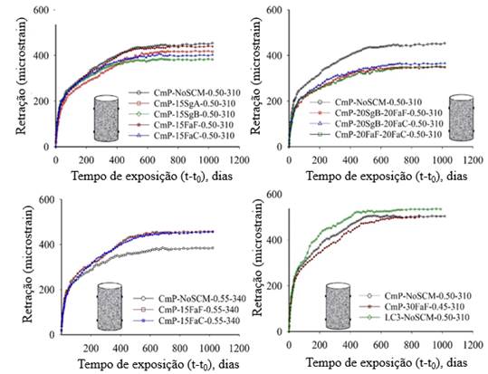 Ensaios em andamento no IIT Madras sobre a retração de concretos com ligantes misturados indicam que a incorporação de SCMs não altera significativamente a evolução da deformação por retração por secagem (consulte os dados de 4 anos na Fig. 5). Pode-se concluir que a substituição do OPC por ≤ 30% de escória e cinzas volantes, no mesmo p/b, não alterará as deformações finais devido à retração por secagem. Isso é de considerável relevância para as práticas de projeto, porque a maioria dos modelos de retração não fornece diretamente provisões para estimar a retração em concretos com SCMs. As descobertas também indicam que os modelos de retração calibrados para concretos OPC (ou seja, sem SCMs) podem ser usados para concretos com SCMs, com alguma recalibração, se necessário.