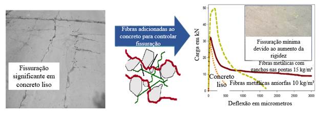 Pavimentos de concreto estão sendo usados mais extensivamente em muitas partes do mundo, e esse tipo de aplicação é promissor para o uso de grandes volumes de cinzas volantes em concreto. No entanto, pode haver problemas (consulte a Fig. 6) de fissuras significativas devido à retração e à carga por fadiga. Tais problemas não podem ser resolvidos apenas aumentando a resistência à compressão do concreto e exigem um aprimoramento direcionado da tenacidade, que é o principal parâmetro de influência no fornecimento de resistência à fissuras adequada. A incorporação de fibras (aço, polímero, metal amorfo e vidro) para melhorar a tenacidade foi estudada extensivamente no IIT Madras (veja a imagem à direita na Fig. 6), levando a diretrizes para ensaios e projeto (Nayar e Gettu, 2015, 2016, 2020). Trabalhos adicionais também mostraram que as fibras de aço podem impedir drasticamente a propagação de fissuras no concreto fissurado sob várias condições de carga (Jose et al., 2018; Stephen e Gettu, 2019a, 2019b).