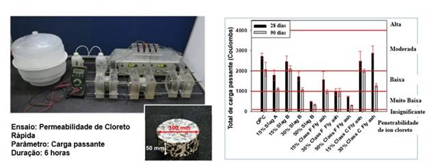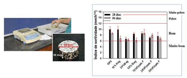 Devido à estrutura de poros refinada, os concretos com SCMs também apresentam menor permeabilidade (Dhanya e Santhanam, 2017). A carga aprovada no ensaio rápido de penetração de cloreto é um bom indicador da permeabilidade do concreto; A Fig. 9 indica a resistência significativa à transferência de carga, especialmente quando os níveis de substituição de escória e cinzas volantes Classe F são superiores a 30%. Por outro lado, o desempenho das cinzas volantes calcárias (Classe C) é avaliado menos do que o das cinzas volantes e escórias Classe F. Observe que, no nível de substituição de 15%, as escórias e as cinzas volantes Classe C exibem desempenho semelhante. A Fig. 10 mostra os dados dos ensaios de absorção de água, indicando que os concretos à base de SCM mostram apenas uma sortividade marginalmente menor do que os concretos OPC. A literatura também não fornece consenso sobre a capacidade de absorção de água e a penetração de cloretos nos concretos com SCMs. Os autores acreditam que, com práticas apropriadas de estudo de dosagem, lançamento e cura, os aspectos positivos dos SCMs podem ser explorados para aumentar a durabilidade dos sistemas de concreto armado.