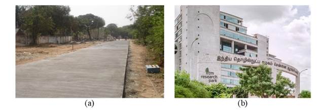 Pavimento FRC en el campus de IIT Madras, y (b) el edificio SCC en IIT Madras Research.