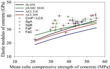 La resistencia a la compresión es probablemente el parámetro más importante que influye en el comportamiento estructural de los sistemas de concreto. Por lo tanto, muchos investigadores han investigado el efecto de los SCM en la resistencia a la compresión del concreto. Sin embargo, todavía existen percepciones y restricciones negativas sobre el uso de SCM para grandes proyectos de infraestructura, principalmente debido a la falta de conciencia sobre las ventajas de dichos materiales y las posibles variaciones en la calidad y el tipo de SCM disponibles de varias fuentes. Para abordar estos problemas, se han obtenido datos experimentales para hormigones que se usan típicamente en el sector de la construcción de la India para cuantificar la evolución de sus fortalezas (Dhandapani et al., 2018; Sakthivel, 2019; Sakthivel et al., 2019). Aunque la resistencia a la compresión a temprana edad de los concretos aglutinantes mezclados podría ser menor que la del concreto OPC, la Figura 3 muestra que los valores eventuales pueden ser mucho más altos, especialmente para niveles de reemplazo del 15% de cenizas volantes y escorias (ver Figuras 3a y b)) La Figura 3c muestra que las mezclas ternarias con 60% de OPC, 20% de escoria y 20% de cenizas volantes pueden presentar mayores resistencias a la compresión en edades posteriores que los hormigones sin SCM. Esto indica la necesidad de planificar adecuadamente el cronograma para el curado y la eliminación del encofrado mientras se usan hormigones con SCM. La Figura 4 muestra que los hormigones con varios SCM exhiben un módulo elástico adecuado, según lo predicho por varios estándares y códigos. En total, se puede concluir que el rendimiento de los hormigones basados en SCM es bueno en términos de propiedades mecánicas.