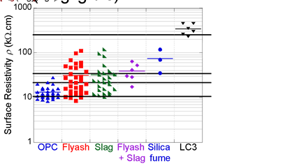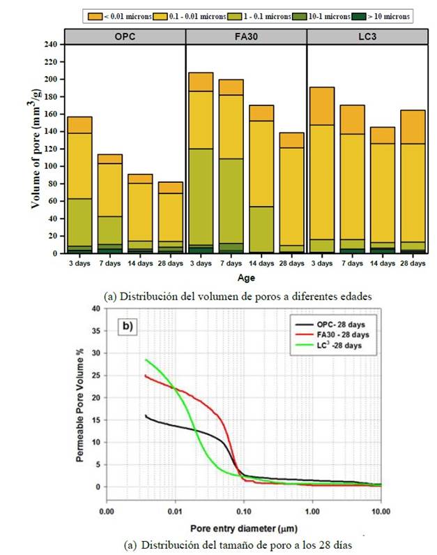 Los concretos con sistemas aglutinantes mezclados exhiben una estructura de poros más refinada que los sistemas OPC debido a las reacciones hidráulicas y puzolánicas adicionales / prolongadas. Dhandapani y Santhanam (2020) realizaron amplios estudios sobre la evolución de la microestructura en ligantes con varios SCM, especialmente sistemas LC3. La Figura 7(a) muestra la evolución de los tamaños de poro en las pastas de cemento endurecido con una relación w/b de 0.35 y preparadas con (i) OPC, (ii) OPC con cenizas volantes (con una dosis de reemplazo del 30%) y (iii) LC3. Los resultados indican claramente que los SCM de reacción más lenta, como las cenizas volantes, provocan un retraso de aproximadamente 14 días para exhibir un refinamiento significativo de los poros, mientras que los SCM de reacción más rápida, como la arcilla calcina calcárea, exhiben poros mucho más finos incluso a los 3 días. La Figura 7(b) muestra las distribuciones de tamaño de poro en los sistemas OPC, FA30 y LC3 a los 28 días de curado. Una lección importante es que los hormigones con cenizas volantes requerirán un curado prolongado para explotar todo el potencial. Un mayor refinamiento de los poros mejorará la resistividad del sistema, como se ve en la Figura 8 para hormigones con SCM, en particular sistemas LC3. En consecuencia, la resistividad más alta conducirá a una mejor resistencia al cloruro y menores tasas de corrosión.