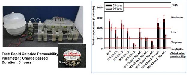 Debido a la estructura de poros refinada, los hormigones con SCM también exhiben una menor permeabilidad (Dhanya y Santhanam, 2017). La carga aprobada en la prueba rápida de penetración de cloruro es un buen indicador de la permeabilidad del hormigón; La Figura 9 indica la resistencia significativa a la transferencia de carga, especialmente cuando los niveles de reemplazo de escoria y cenizas volantes de Clase F son más del 30%. Por otro lado, el rendimiento de las cenizas volantes calcáreas (Clase C) tiene una calificación menor que la de las cenizas volantes y la escoria de la Clase F. Tener en cuenta que con un nivel de reemplazo del 15%, tanto la escoria como la ceniza volante Clase C exhiben un rendimiento similar. La Figura 10 muestra los datos de las pruebas de sorptividad del agua, lo que indica que los hormigones basados en SCM muestran una sorbilidad marginalmente menor que los hormigones OPC. La literatura tampoco proporciona ningún consenso sobre la capacidad de absorción de agua y la penetración de cloruros de los hormigones con SCM. Los autores creen que con las prácticas apropiadas de diseño de mezcla, colocación y curado, los aspectos positivos de los SCM pueden explotarse para mejorar la durabilidad de los sistemas de hormigón armado.