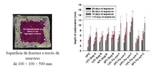 La resistencia a la penetración de CO2 es generalmente buena en los sistemas OPC debido al alto tampón de hidróxido de calcio. Sin embargo, debido a las prolongadas reacciones puzolánicas, los concretos basados en SCM exhiben amortiguadores de hidróxido de calcio más bajos y, en consecuencia, una menor resistencia a la carbonatación. Debido a la menor disponibilidad de Ca(OH)2 en los sistemas basados en SCM, el CO2 puede carbonizar el CSH en un momento anterior, lo que lleva a una rápida progresión del frente de carbonatación. Dhanya (2015) mostró, a partir de estudios de carbonatación acelerada bajo 1% de CO2, que las profundidades de carbonatación en hormigones que tienen más del 15% del OPC reemplazado con cenizas volantes de Clase F podrían ser mucho más altas que con solo OPC como cementante (ver Figura 14). Por otro lado, el aumento de la carbonatación para las mezclas sustituidas con escoria no fue significativo. Los resultados de la carbonatación natural de estudios recientes también han mostrado mayores profundidades de penetración para hormigones mezclados SCM. Por lo tanto, se puede esperar que el inicio de la corrosión debido a la carbonatación ocurra antes en hormigones con SCM, si se expone sin ningún recubrimiento. Sin embargo, la propagación de la corrosión aún dependería de la disponibilidad de humedad y oxígeno, así como de la conductividad (o viceversa, la resistividad) del medio; se espera que estos factores compensen y produzcan una situación favorable para los SCM. Teniendo en cuenta todos estos aspectos, es posible diseñar de manera efectiva un concreto basado en SCM para situaciones donde la carbonatación podría gobernar la durabilidad. Por lo tanto, se advierte que no se abstenga de usar hormigones con SCM, sino que los ingenieros podrían adoptar medidas de mitigación, como los recubrimientos anticarbonatación, para compensar los efectos adversos debido a la carbonatación potencialmente más rápida.