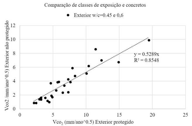 Na Fig. 1 são apresentados os resultados da comparação das taxas de carbonatação (Galan et al. 2010) de ensaios de amostras no clima de Madri durante 4 anos de dois tipos de concretos (com razões w/c de 0,45 e 0,6 e de acordo com, 400 e 300 kg de cimento por m3 de concreto) expostos ao ar livre, protegidos e expostos à chuva. A equação resultante (Galan et al. 2010) nesses ensaios é dada a seguir. Essa relação pode ser diferente em outros climas.