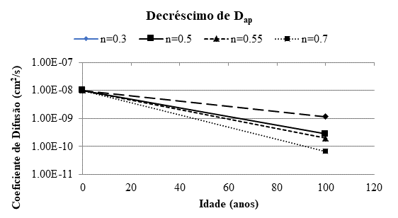 A redução com o tempo do coeficiente de difusão de cloreto é empiricamente abordada (Mangat e Molloy, 1994), considerando que o Dap diminui com o tempo (Fig. 2) seguindo a equação [3] onde n = “fator de envelhecimento”, D0 = coeficiente de difusão no tempo inicial de ensaio t0 (geralmente 28 dias) e ti é o período até quando se supõe que o coeficiente diminua: