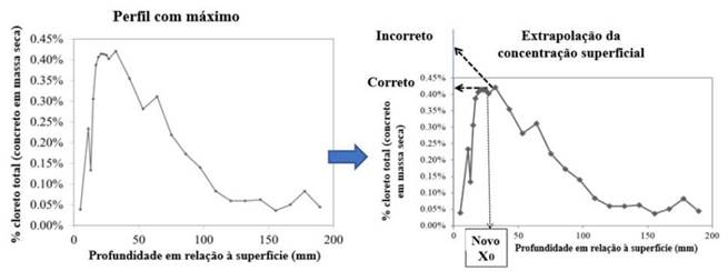 A outra principal limitação está relacionada à consideração de um pico de cloreto que pode ocorrer a poucos milímetros de profundidade, mas não na superfície (Fig. 3 à esquerda) (Andrade, 2015). Esse máximo foi atribuído à “convecção” por absorção capilar, embora pareça mais provável que seja devido à carbonatação da superfície, mas esses motivos não são suficientes para explicar como é possível que a concentração da superfície seja menor que a interna, porque a concentração de cloreto pode até ser quase nula na superfície do concreto na Fig. 3. Deve-se observar também que, para calcular o coeficiente de difusão aparente, a equação Dap, [2] pode ser ajustada neste formato de perfil com o máximo, fornecendo a profundidade “zero” (Fig. 3 à direita) é considerado o da posição máxima (Andrade, 2015), porque o perfil do máximo evolui de acordo com a lei de Fick. Ou seja, o ajuste da equação [2] não deve ser feito extrapolando o máximo de volta à superfície, porque a concentração da superfície seria muito maior que a real. O valor de x0 na figura (distância da superfície à posição máxima) deve ser adicionado ao resultado do cálculo da profundidade do limiar de cloreto (Andrade, 2015) da equação [2]. O que é desconhecido é porque os cloretos tendem a diminuir na superfície e como o máximo se move para dentro, ou seja, a lei de sua evolução com o tempo a longo prazo.