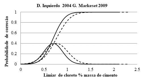 Com relação ao processo de cloreto, a corrosão começa quando certas concentrações críticas de cloreto entram em contato com a superfície do aço. O valor normal considerado em várias normas é de 0,4% em massa de cimento, embora valores tão altos quanto 2-3% possam não desenvolver corrosão em algumas circunstâncias. Então, o limiar não é uma quantidade fixa, mas é um intervalo de valores (Izquierdo et al. 2004; Markeset, 2009) que podem ser tratados estatisticamente. A distribuição de Izquierdo et al. (Izquierdo et al. 2004) é apresentada na Fig. 6. Ele tem um valor médio de Cx = 0,70% (por massa de concreto) com um desvio padrão de ± 0,20%. A distribuição estatística de Markeset (Markeset, 2009) encontrada em estruturas reais é quase semelhante (pontes na Noruega onde os testemunhos extraídos foram perfurados até a barra e a observação de corrosão incipiente foi identificada como o limiar de cloreto).
