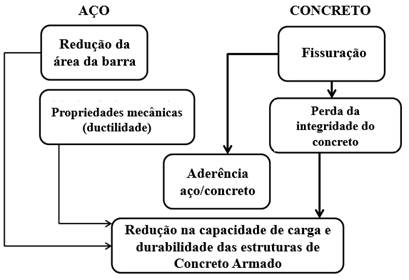 O avanço progressivo da corrosão e a perda no diâmetro da barra e dos óxidos formados induzirão várias consequências estruturais descritas no Manual CONTECVET (2001) (Fig. 7):