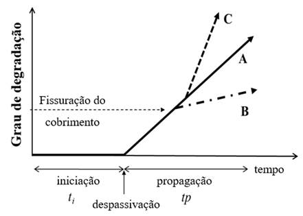 No presente trabalho são apresentadas as limitações dos modelos de iniciação da corrosão com indicações para superá-los. O projeto de durabilidade baseado no desempenho é atualmente uma tendência considerada no Model Code fib (MC2010). No entanto, ainda estamos longe de prever com precisão o desempenho de uma estrutura em um ambiente específico, apesar dos requisitos baseados em desempenho serem introduzidos nas especificações concretas de grandes infraestruturas que exigem 100 anos ou mais de vida útil. Também são comentados o processo de despassivação e o período de propagação com considerações sobre seu tratamento probabilístico. Propõe-se considerar o início da corrosão como um "estado limite de deterioração ou iniciação" (DLS ou ILS). Um exemplo de cálculo é o tempo de corrosão induzida por fissuras no cobrimento.