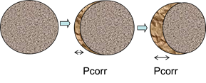 Como o clima pode ser constante ou repetido a cada ano, a corrosão acumulada ou a profundidade de corrosão, Pcorr, (veja a Fig. 9), que é a perda de diâmetro Pcorr, = ((= (0- (i, pode ser, como comentado anteriormente, linear em relação ao tempo (linha A na Fig. 8) ou pode ser considerada uma tendência de duas linhas onde a corrosão diminui com o tempo (Vcorr1> Vcorr2 - linha B) ou aumenta (Vcorr1 <Vcorr2 - linha C).