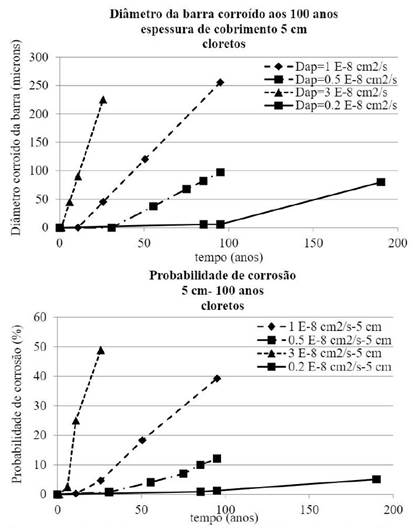 onde: P{} é a probabilidade de que fissuras paralelas sejam produzidas, tSL é a vida útil do projetoVUP [anos], tini é o período de início [anos], tprop é o período de propagação [anos], P0 é a probabilidade de falha alvo. A Fig. 10 mostra, para fins de ilustração do exemplo, a probabilidade de fissuras do cobrimento (para perda de diâmetro da barra de Pcorr = 100 (m (Andrade et al. 2017) associada à fissuras do cobrimento) para vários coeficientes de difusão de cloreto (e taxas de corrosão associado à qualidade do concreto) em um elemento hipotético de 5 cm de cobrimento nominal e uma vida útil de 100 anos.