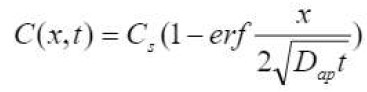No caso de penetração de cloreto, o cálculo é feito através da expressão denominada “equação da função de erro” (equação [2]) em que C (x, t) é a concentração crítica de cloreto que leva à despassivação dentro do concreto à distância x por um tempo t, Cs é a concentração superficial ou externa de cloreto e Dap é o coeficiente de difusão aparente: