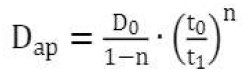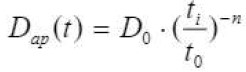 Esta equação indica que o valor inicial do Dap é alterado para um menor para os cálculos na equação [2]. Embora geralmente aceito, não é indicado como ou quando testar a diminuição e o período de tempo de sua aplicação. Consequentemente, se o período de aplicação é longo, leva a um coeficiente de difusão muito baixo, como mostra a Fig. 2, onde se deduz que, dependendo do fator de envelhecimento (n) considerado, a diminuição pode ser de um ou dois ordens de magnitude. Então, devido às incertezas na extrapolação de um ensaio de curto prazo para longo prazo, a redução deve ser limitada. Uma "boa prática" possível é limitar, dependendo do tipo de cimento, a redução para 1 ano (cimento Portland), 5 anos (cimento com adição de minerais que não sejam escórias ou calcário) ou 10 anos (cimentos com escória como adição de minerais) ou a uma diminuição para limitar a um máximo de uma ordem de magnitude. Finalmente, uma modificação desta equação foi proposta por Gulikers (Tang e Gulikers, 2007) (ver equação [4])
