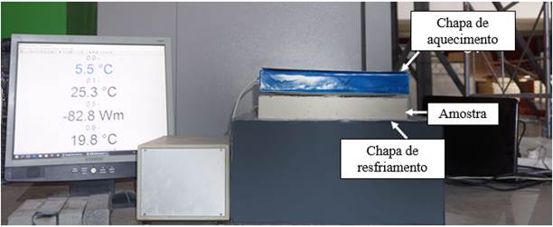 Os ensaios de condutividade térmica foram conduzidos de acordo com a ISO 8301: 1991 usando um aparelho de medidor de fluxo de calor (Ahlborn) em compósitos planos e PCM. A Fig. 2 mostra a configuração do ensaio de condutividade térmica. Amostras com dimensões de 350 x 350 x 25 mm foram utilizadas para as medições de condutividade térmica e mantidas em água de cal saturada à temperatura de 21 ± 1 ℃ por 28 dias. As amostras foram secas a 60 ° C até atingirem massa constante para evitar qualquer erro de ensaio à base de umidade. Os ensaios começaram quando a amostra chegou à temperatura ambiente. A determinação da condutividade térmica foi realizada em uma condição de estado estacionário com uma temperatura média de + 10 ℃ no centro da seção transversal da amostra.