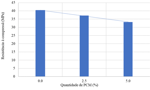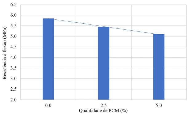 A Fig. 4 mostra a variação dos valores de resistência à flexão com a quantidade de PCM. É claro que as resistências de flexão diminuem à medida que a quantidade de PCM na mistura aumenta. Quando a quantidade de PCM é de 2,5% e 5%, as resistências de flexão diminuem em 7% e 13%, respectivamente.