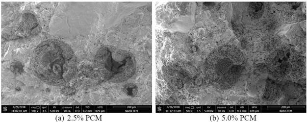 As Figs. 7a e 7b mostram imagens SEM de misturas contendo 2,5% e 5% de PCM, respectivamente. É claro que os PCM microencapsulados são colocados mais próximos uns dos outros com 5% de uso, mas as cápsulas de PCM não se tocam enquanto preservam a integridade da fase da argamassa entre eles.