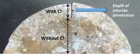 | Figure 1. Chloride penetration depth measurement by visual colorimetric method by spraying an aqueous solution of 0.1 M AgNO3. | ||||