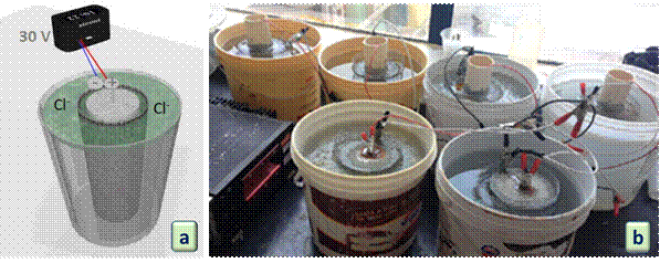 For testing this experiment, all specimens were saturated and then immersed in an aqueous solution with 3% NaCl, since migration occurs in a saturated medium. Then, a steel bar and a wire mesh were connected to a 30 V electrical source, inducing the positive pole in the hole inside the sample. In this way, the Clˉ anions, disassociated in the sodium chloride solution, were electrostatically attracted into the specimens. Figure 3 shows a schematic of the apparatus assembled to induce chloride penetration in concrete specimens.