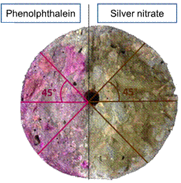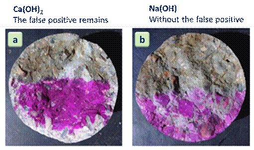 Figure 5 shows the result of the attempt to neutralize the effect of carbonation in the test with silver nitrate using the spray of an aqueous solution saturated with calcium hydroxide and another saturated with sodium hydroxide. All samples were carbonated and free from chloride contamination.