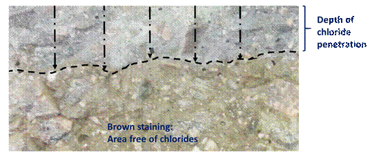 Procedure to detect the penetration of chlorides into carbonated concrete with silver nitrate