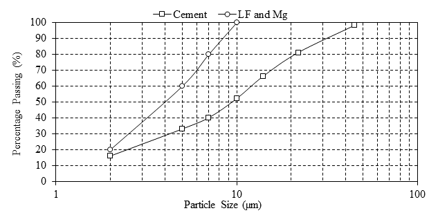 Mg is an inert material by nature but could chemically react with the amorphous silica in fly ash under sulphate rich environment (Zhang et al. 2014, Moore et al. 2009). However, this condition at which Mg can chemically react does not apply in this study and therefore, Mg was considered an inert material. Mg was used to evaluate and measure the combined physical effects of LF while LF was used to measure the combined physical and chemical effects. The difference in performance between LF and Mg mixtures is attributed to the chemical reaction of LF.