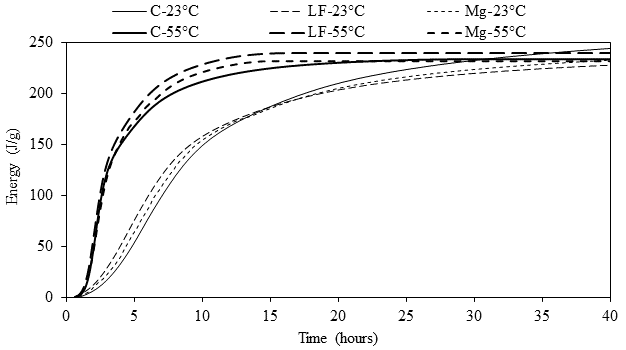 The physical effect of LF (the difference in the results between control mixture made of 100% cement and mix Mg) increased the heat of hydration compared to control mixture made of 100% cement. This increase is caused by the heterogeneous nucleation which causes acceleration in the hydration rate. The chemical effect of LF (the difference in the results between mix LF and mix Mg) showed an additional increase in the heat of hydration. This increase in heat of hydration was caused by the chemical reaction of LF and calcium aluminate which is an exothermic chemical reaction (Chowaniec 2012). The combined effect (physical and chemical) of LF was influenced by curing temperature. This was evident in total heat released after 40 hours where LF reduced the total heat released when cured at 23°C and increased the total heat released at 55°C compared to control mix made of 100% cement.