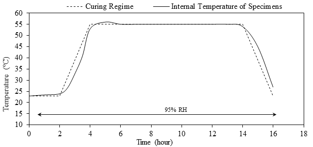Paste, and mortar specimens were steam cured at 55°C and 95% relative humidity (RH) for 16 hours as presented in Figure 2. A 0.45 m3 Cincinnati Sub-Zero environmental chamber was used. A maximum curing temperature of 55°C was used in order to prevent any formation of delayed ettringite (Brunetaud et al. 2006). Following steam curing, the specimens were placed in limewater at 23°C until tested.