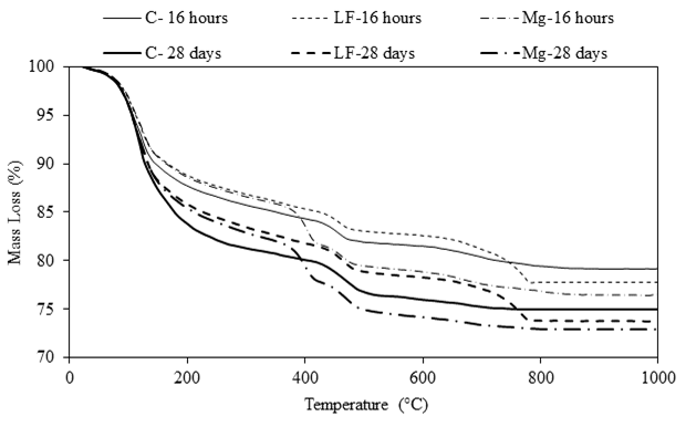 The thermal analysis was used to measure the amount of reacted LF and to confirm that Mg is chemically inert material. In addition, a relative evaluation of hydration products was conducted using Ca(OH)2 content. The mass loss from TG analysis and the DTA results are presented in Figures 4 and 5, respectively. Figure 4 presents the mass loss with temperature. Figure 5(a) presents DTA results for control mixture made with 100% cement while Figures 5(b) and (c) present DTA results for mixes made with LF and Mg, respectively. Based on the measured data, Ca(OH)2, CaCO3, and Mg contents were calculated using Equations 3 through 8. The results in Figures 4 and 5(b) showed that the addition of LF increased Ca(OH)2 content at 16 hours compared to control mixture made with 100% cement. The content of Ca(OH)2 increased from 7.4 wt% in control mixture made of 100% cement to 8.6 wt% in mix LF. This is expected as the additional surface area provided by LF acts as nucleation sites for the precipitation of the hydration products. This accelerates the hydration process resulting in a higher Ca(OH)2 content in mix LF compared to control mixture made of 100% cement. At 28 days, the Ca(OH)2 content in mix LF and control mixture made of 100% cement were approximately similar (11.9 wt% in control mixture made of 100% cement and 12.2 wt% in mix LF).