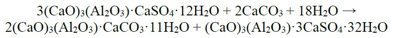 The chemical interaction between LF and other hydration products was debated. However, research work in the past 20 years proved that LF is not a chemically inert material but rather a partially reactive material (Hooton et al. 2007, Hawkins et al. 2003). LF reacts with monosulfate ((CaO)3(Al2O3)·CaSO4·12H2O) and calcium aluminate hydrate ((CaO)3(Al2O3)·6H2O) to form calcium mono-carboaluminate (3CaO·Al2O3·CaCO3·11H2O) as presented in Equations 1 and 2 (Kakali et al. 2000, Bentz 2006, Kuzel et al. 1996). The reactions between LF and monosulfate and calcium aluminate hydrate take place after the exhaustion of sulfate ions in the system (Wang 2010). In addition, the fineness of LF influences these reactions; the higher the fineness of LF the more LF is consumed in these reactions (Hooton et al 2007).